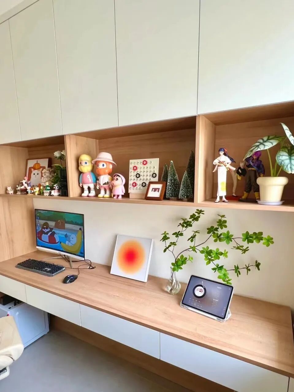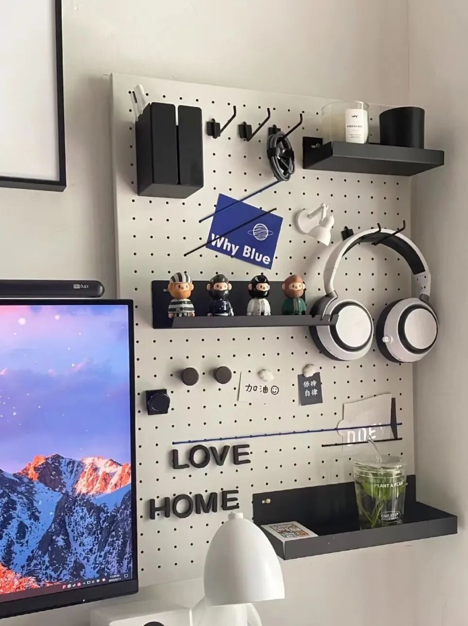 再搭配上一些拍立得照片、小卡片等等,氛围感挠得一下不就上来了吗!洞洞板还可以搭配一些木质板材同时使用,摆放手办、盲盒甚至是小绿植也是很好的选择哦!