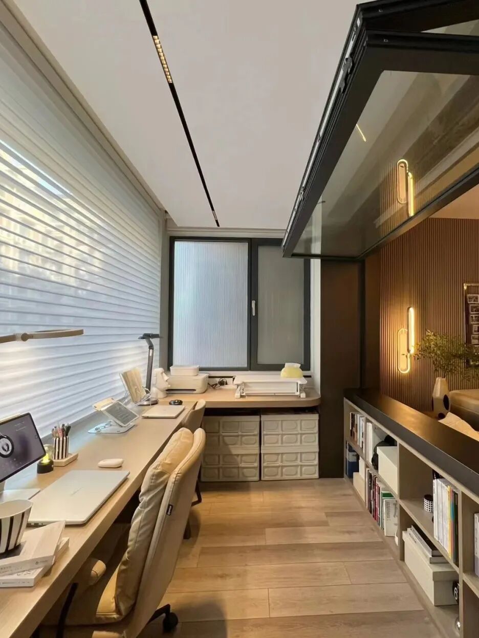 如果你家没有书房区域,又特别想要一个看书学习的空间时,就可以借鉴这个办法!利用窗边阳台的区域,打造一个开放式书房。书桌沿窗边定做悬浮式书桌,节省空间之余,采光也是杠杠的。
