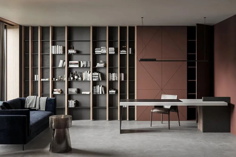 下面是开放式柜格,可以放置一些装饰摆件、相框、手办,起到增加书房趣味性的作用。也可以摆放平时常用的书本,不用起身方便拿取。桌面下方定制推拉抽屉,收纳能力max,桌面也能常保整洁。
