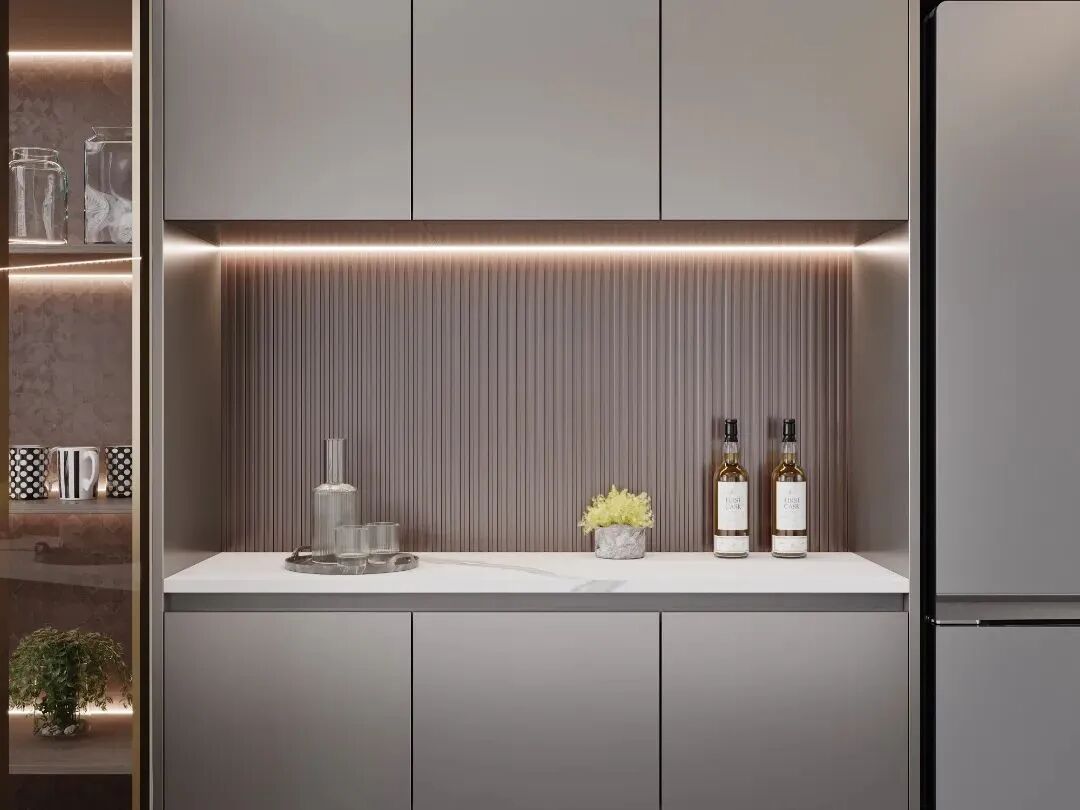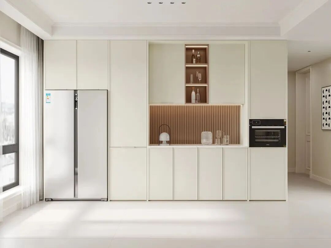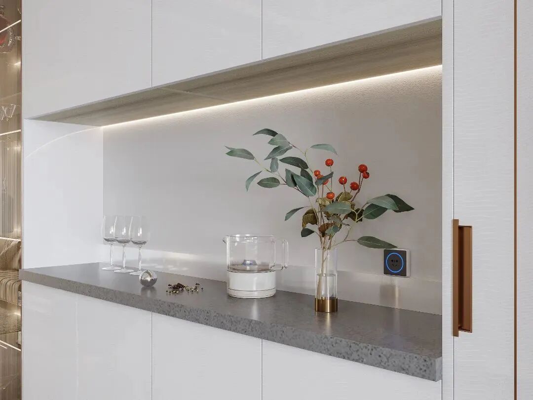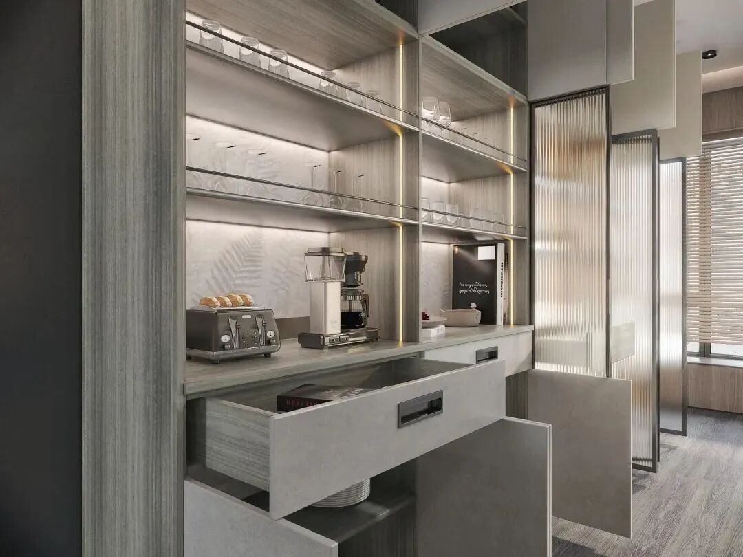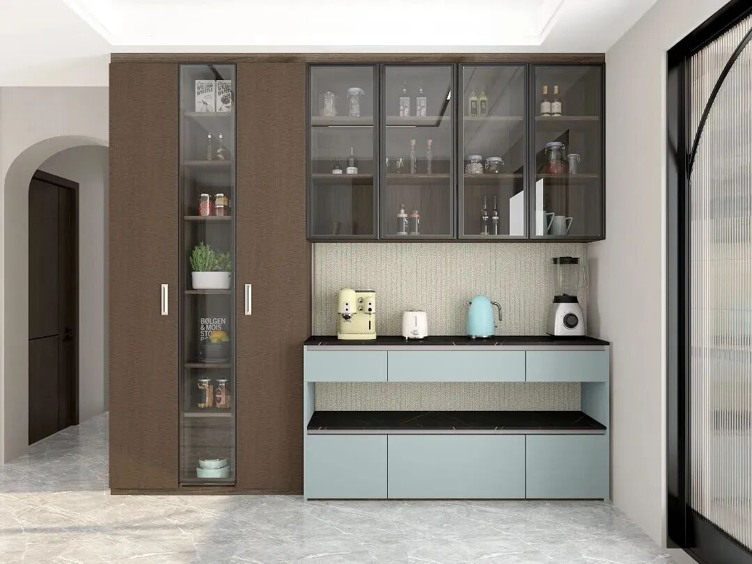 餐边柜镂空层的设计,让小家电也有了操作台,但如果高度不合适使用起来体验感就大大减弱,考虑到操作和水汽散发,推荐高度≥60cm。