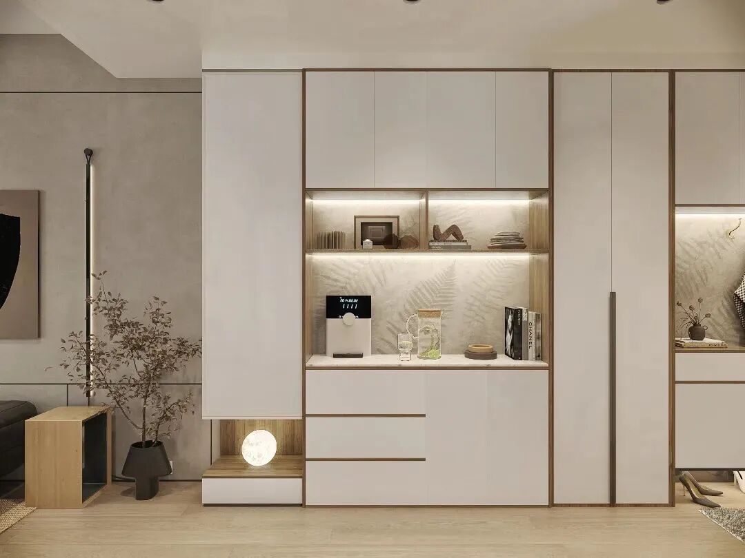 柜门门板别选用高光板,容易反光看起来比较廉价,还容易留下指纹,可以看看最近流行的肤感门,这种样式看起来更有柔和。造型上如若不是手办爱好者或者有专门的物品需要展示,那不建议用玻璃式开放格。