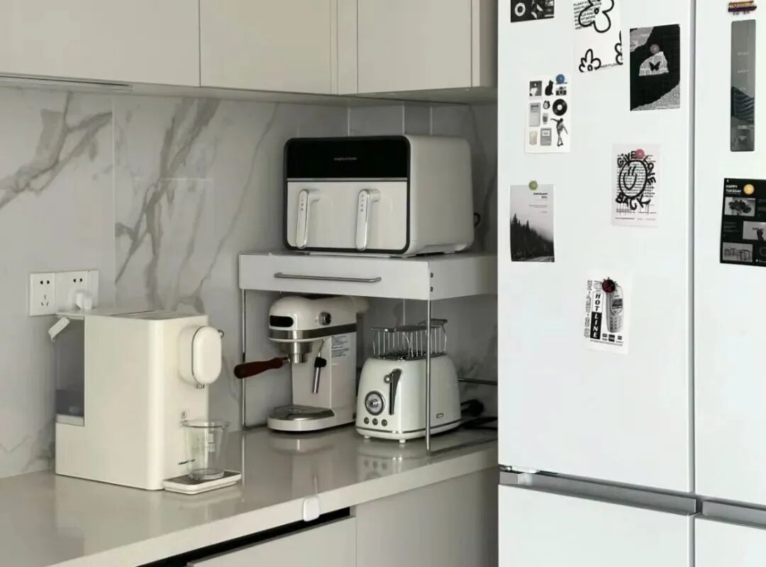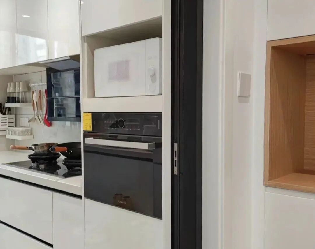 将烤箱、微波炉等小家电嵌入橱柜内,不占用多余的收纳空间,日后更方便打理,整体空间也会更加整洁,另外一定要提前考虑好小家电的收纳空间,厨房的小家电多容易出现杂乱现象。