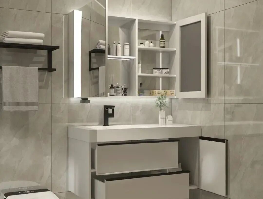 镜子是卫生间的标配,在洗手池上方设计镜柜,既满足了日常生活的基本需求,同时也给卫生间提供了隐藏收纳区,镜柜打开后还可收纳一些瓶瓶罐罐,让整个卫生间都整洁又有序。
