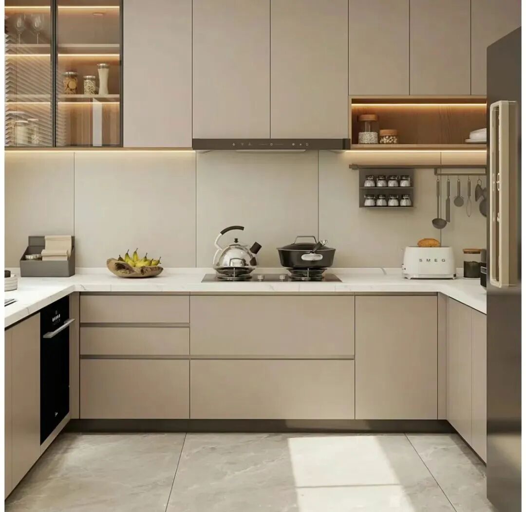 厨房可以做L型、U型、一字型、双边型等空间布局,如果空间允许的情况下还是建议做U型空间布局,由冰箱拿菜—洗水池洗菜—案板切菜—灶台烧菜的流程,循序渐进,路线更加顺畅。