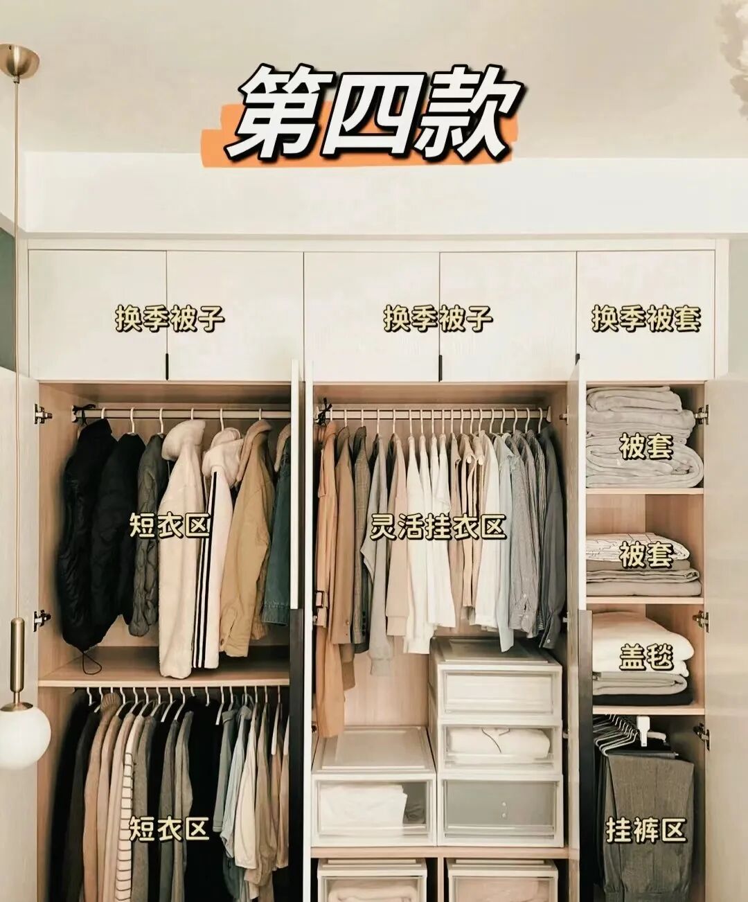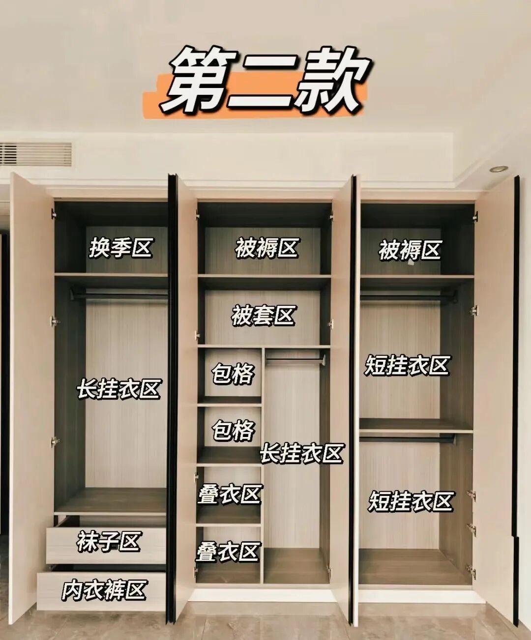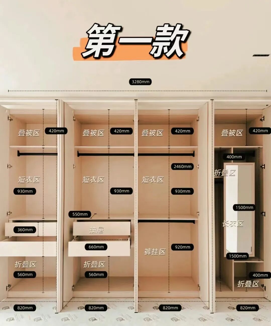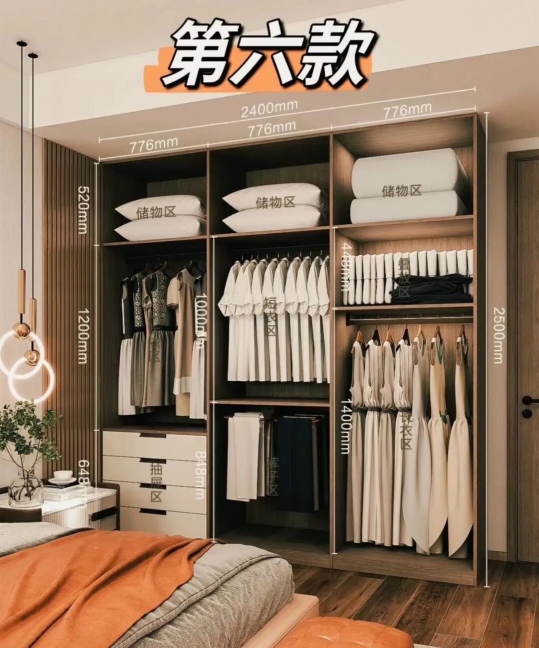 为了确保每个区域都能得到合理有效的利用,我们需根据各区域的实际使用需求,灵活调整衣柜隔板的高度(可参考以下图示进行布局)。