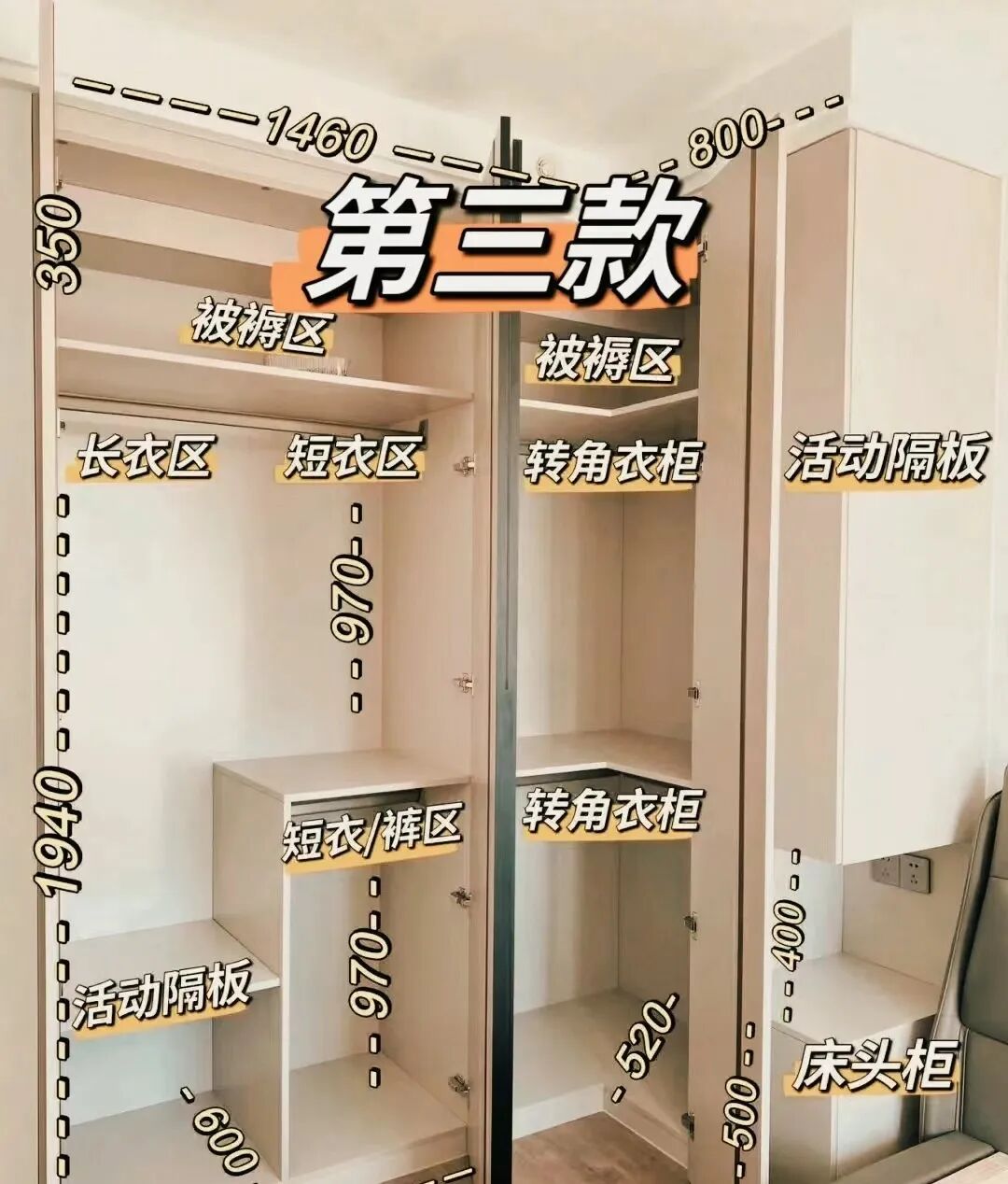 在测量收纳区整体空间尺寸的同时,我们同样需要精心规划收纳柜内部的尺寸布局。例如,衣柜通常包含挂衣区、叠放区以及过季被褥存放区等多个功能区域。