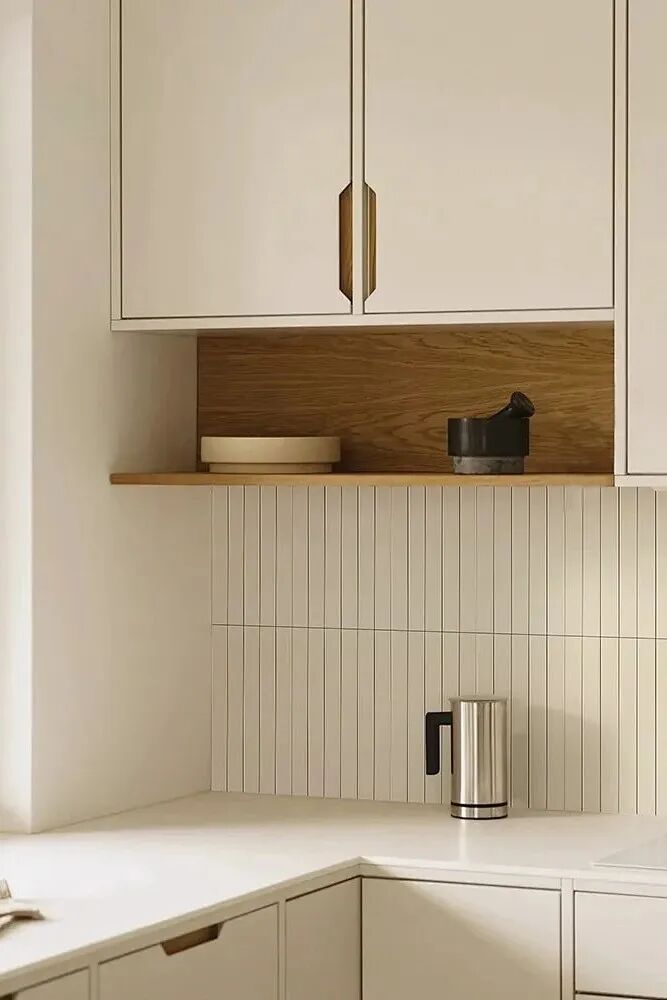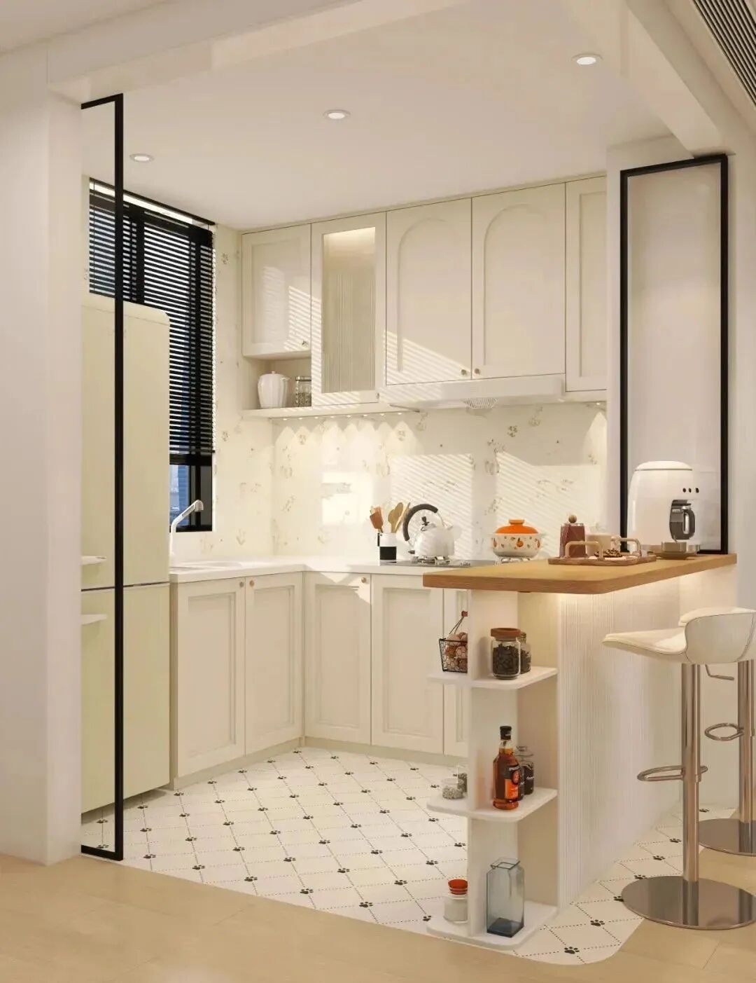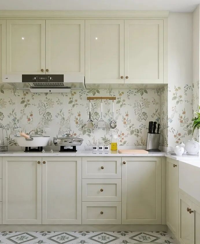 在单调的厨房墙面局部铺贴花砖,与大面积素砖形成对比,瞬间成为视觉中心。灶台或水槽后方用花砖装饰,既实用又美观,除了能划分功能区,还让烹饪区更具仪式感~