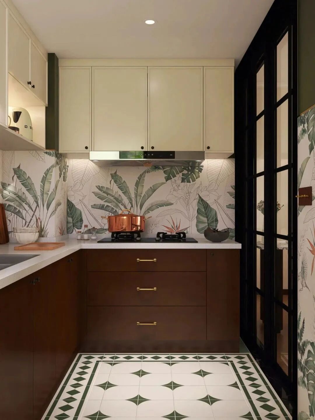 浅绿色顶柜与深棕色橱柜,搭配绿色枝叶纹样花砖,撞色更跳脱,打破单调,增添了浓郁复古的氛围~