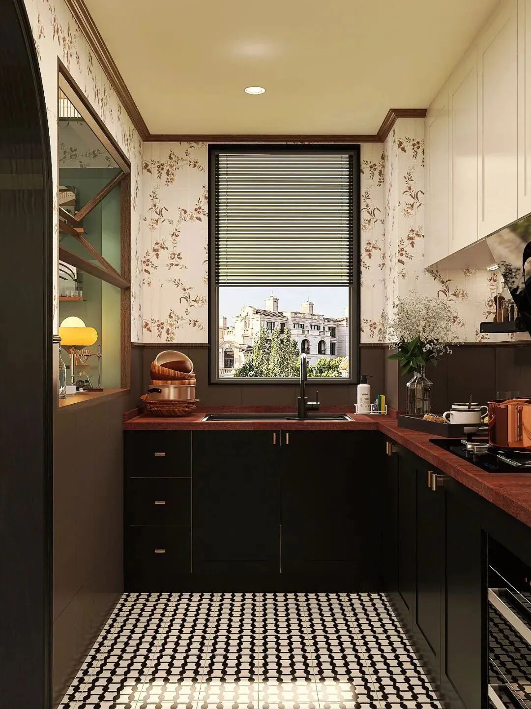 中古风厨房,黑白清新的花砖,打破了房屋整体风格的厚重感,同时提升视觉明度,家变得更和谐。