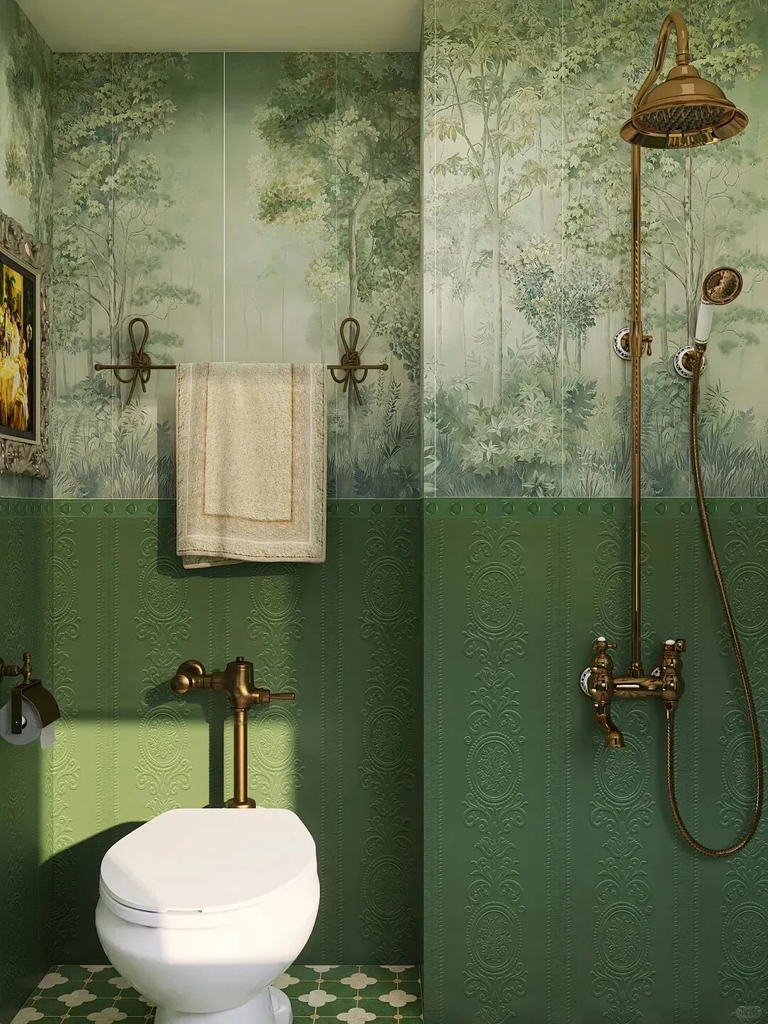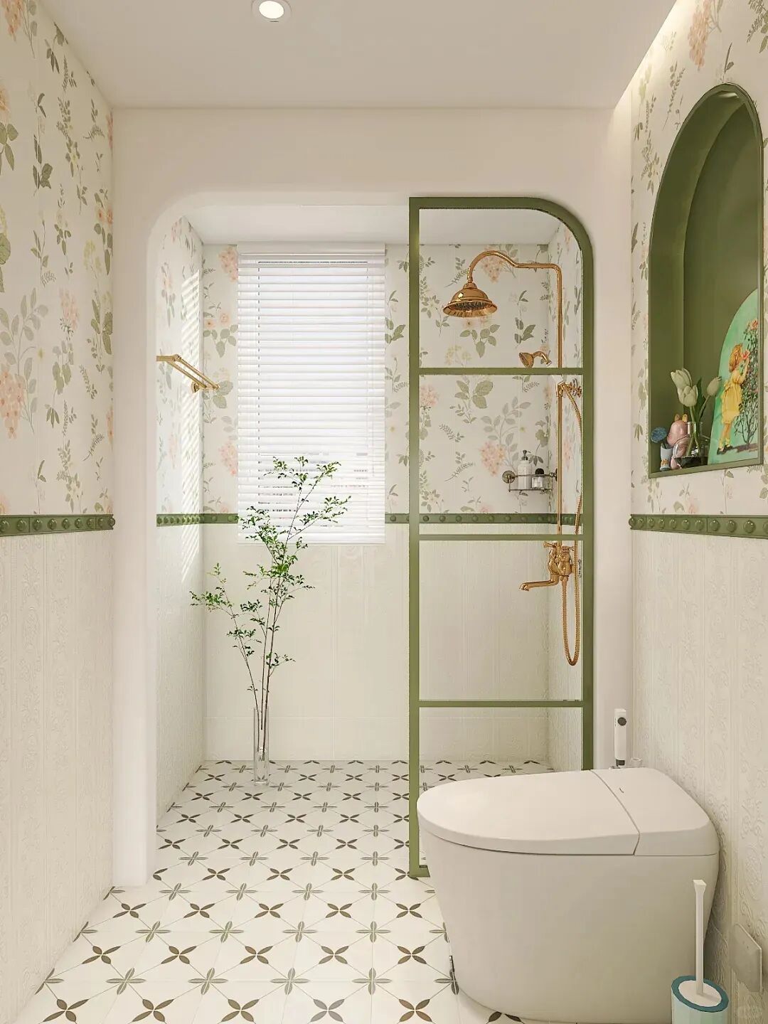 极具法式情结的陶瓷图案小花砖,低饱和清新绿墙面+同色系腰线砖,搭配米白地面,打造出空间的森系质感与自然治愈感~