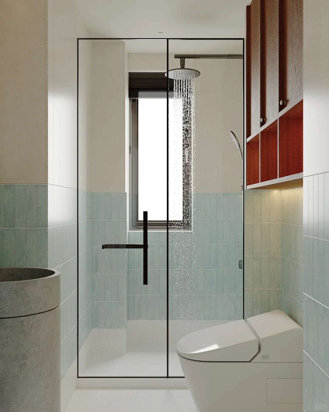墙面下半段铺浅蓝釉面竖花砖,上半段留白,搭配胡桃木置物柜和特色卫浴五金,都市摩登感呼之欲出~