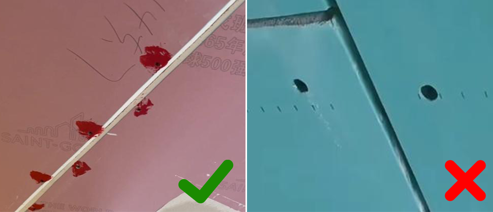木工吊顶固定石膏板的螺丝钉,点涂防锈漆&膏灰涂抹,双重保障,避免后期生锈出现黄色锈斑污染墙面!
