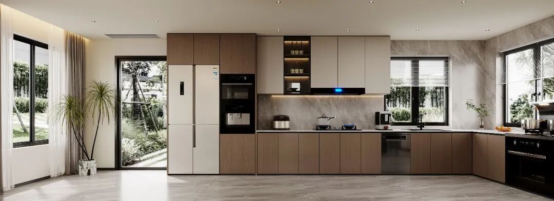 L型功能区布局清晰,内嵌冰箱、烤箱等电器,功能高度集成,操作区涵盖烹饪、洗涤、备餐,动线流畅,满足日常烹饪的多样需求。