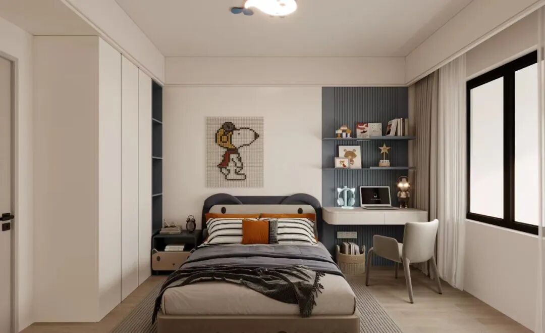 白色中融入深蓝,点亮童趣与活力,墙面衔接自然,造型床、像素画与悬浮书桌,共同为孩子打造了一个清新活泼的天地。