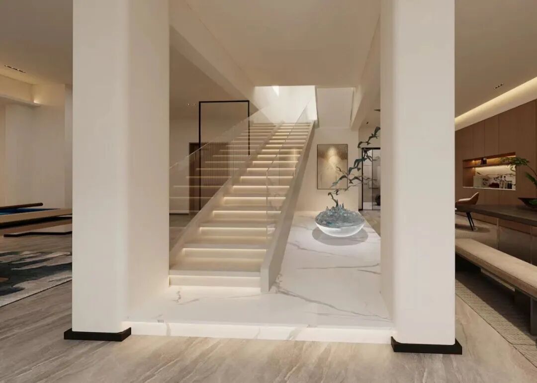 白色踏步+玻璃护栏,弱化楼梯本身的厚重感,视觉上显轻盈。踏步底部暗藏灯带,光影流淌,旁侧造景同时强化了空间艺术氛围。