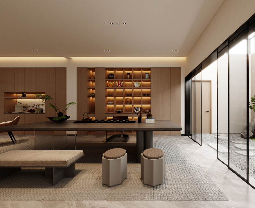 地面铺设地毯,柔化木质与玻璃的冷感,博古架内置暖光,错落陈列的茶具与艺术品在光影中更显韵味。