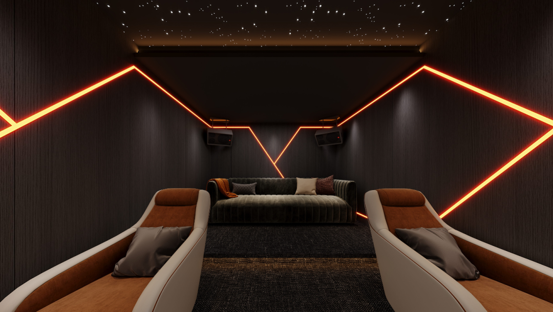 顶部星空顶,皮质躺椅搭配抱枕,地毯提升吸音效果,黑色环绕音响保障立体音效,达到沉浸式观影,营造居家私人影院~