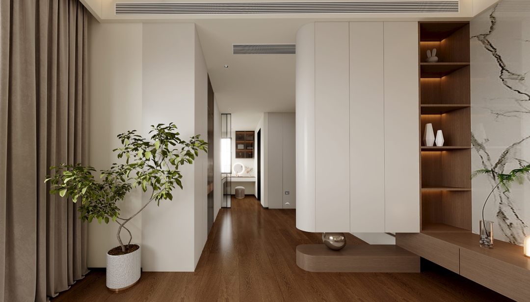 衣柜以圆弧边缘柔化空间线条,底部基座+球形装饰,收纳也成为艺术的展示。