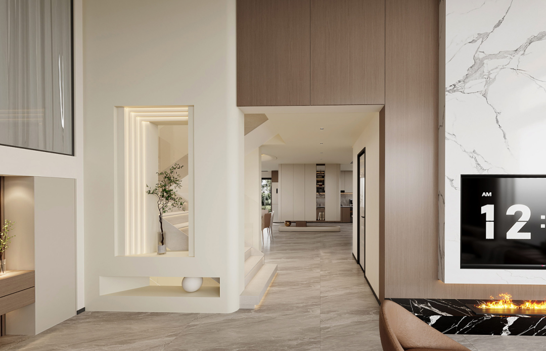 面对大门的墙壁以斯卡帕叠级手法打造出一方镂空造景,配合灯带、绿植与摆件,成为一幅艺术端景,与后方楼梯区域视觉互动,让空间在起始处便豁然开朗。