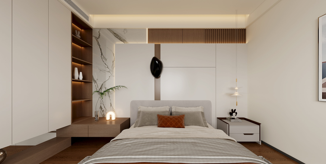 一体化收纳设计将通顶衣柜、开放格与床头柜功能整合,实现三重功能,高效且优雅~