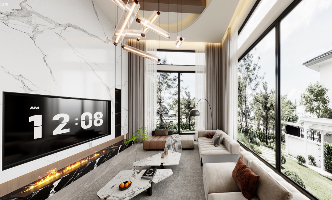 客厅挑高,气势天成。电视背景墙选用大花白大理石,其天然纹理自带高级感。圆弧吊顶以强烈的线条感,成为视觉焦点,落地窗衔接两面,引入充足自然光。