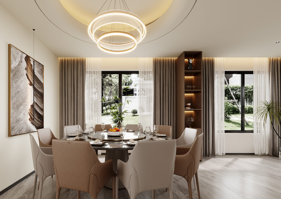 开放式布局让餐厅与周边空间自然衔接,清晰划分区域,岛台旁玻璃门引入光线与外界景致,打破了传统的封闭感。