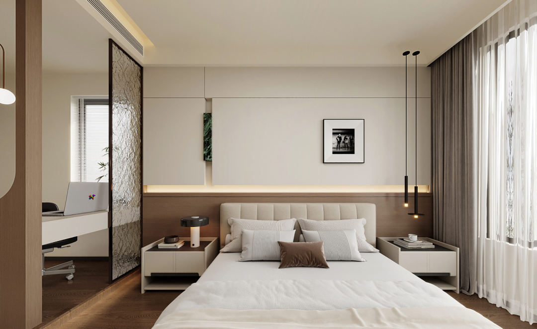 纹理玻璃隔断划分出办公区,不占用过多空间,也与睡眠区自然分离,空间既有设计感,又能轻松容纳睡眠+办公的双重需求。