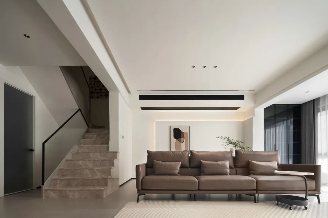 客厅以简洁的线条搭配美拉德色系家具,体现快节奏生活中业主追求的简约纯粹心态。无主灯设计,提升空间的通透感,带来安静纯粹的舒适感。