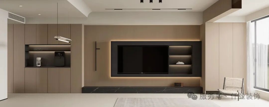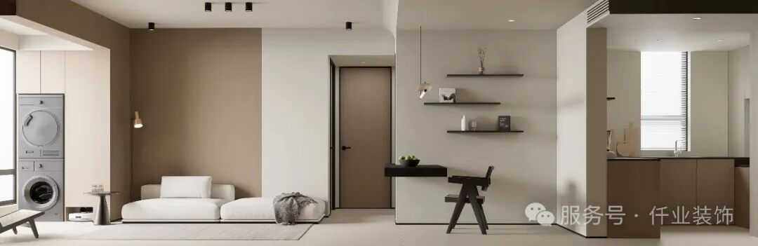 室内通过大面积收纳+视觉延伸来重构空间的秩序,用顶天立地的咖色柜体串联了玄关、客厅与阳台,形成统一的视觉背景,开放式布局打破功能区的壁垒,光线在室内自由流淌。