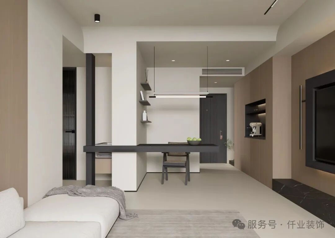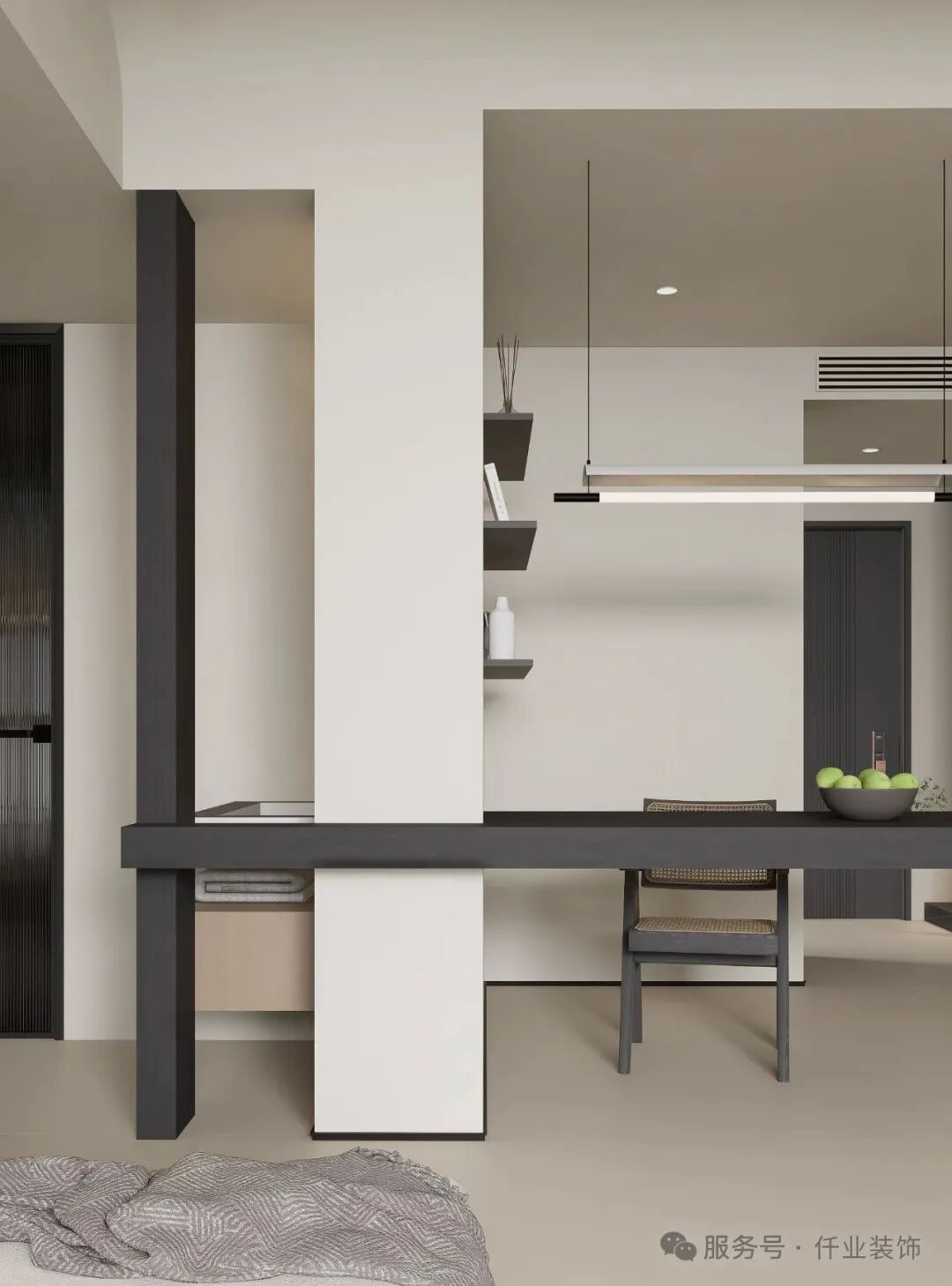 餐厅与卫浴的交界处,一道白色墙体生长出黑色台面,向左延伸为办公区or餐桌,向右则化作洗漱台边界。