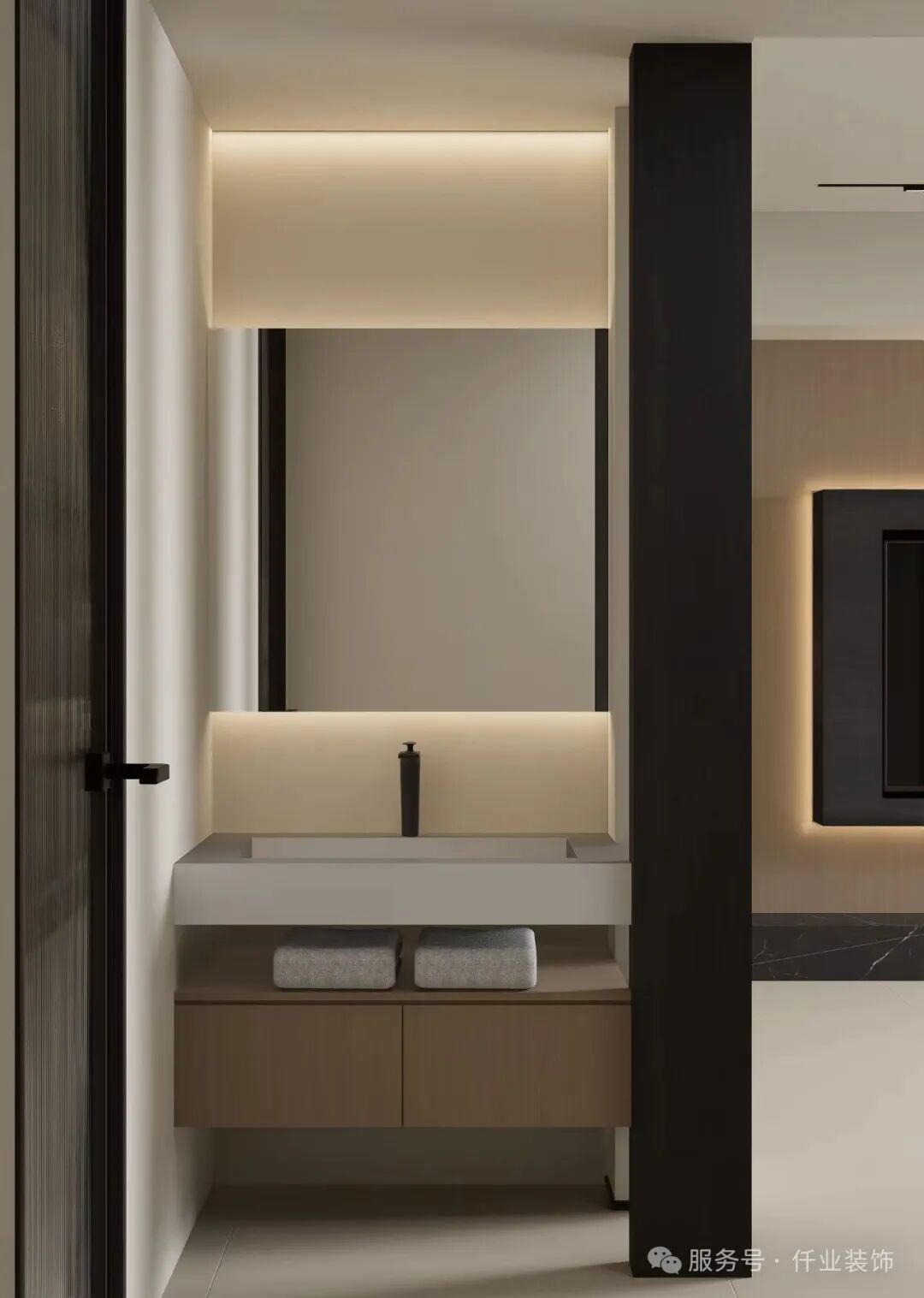 柱体旁打造洗漱台,光线穿透而过,拓宽室内视野。上方的镜柜内置灯带,晨间梳妆时,光线从镜侧均匀洒落,底部柜体收纳洗护用品,保持台面洁净。