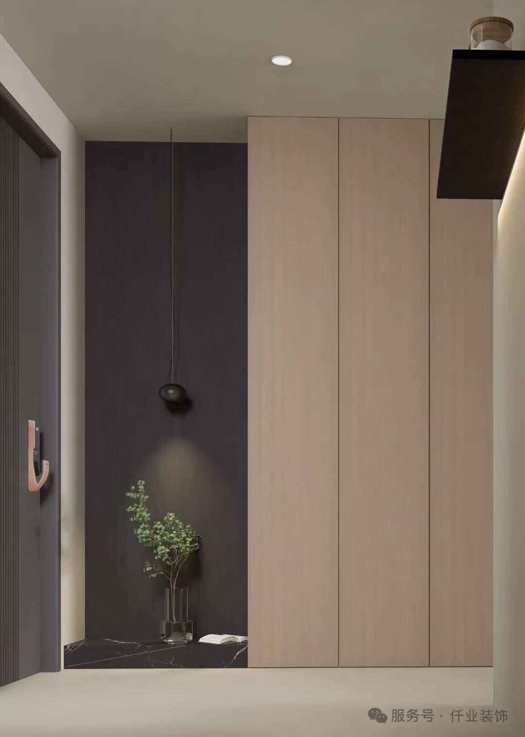 推开门的刹那,一抹绿意在进门处舒展,顶部小吊灯洒下柔和光晕,绿植的生机打破柜体的厚重感。