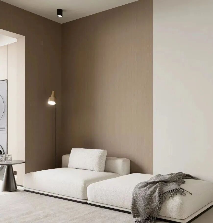 乳白色布艺沙发蓬松柔,背后的浅棕与白色拼色墙非对称分割,木纹与纯色的碰撞消解了空间的单调。
