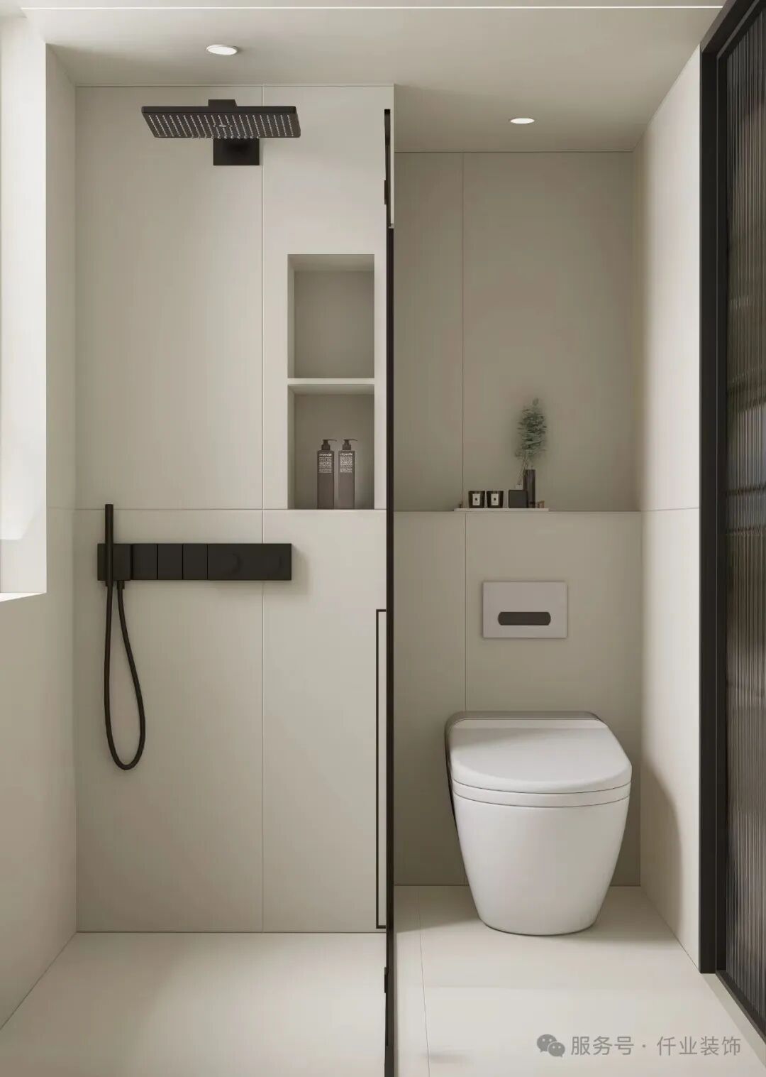 洗漱台、马桶、淋浴区独立分开,卫浴功能更加明确化。卫浴门内布局干湿分离,外侧是智能马桶区,里侧是玻璃隔断的淋浴间,壁龛内嵌成为不经意的点缀。全屋通铺的乳白色瓷砖泛着哑光质感,散发清爽质感。