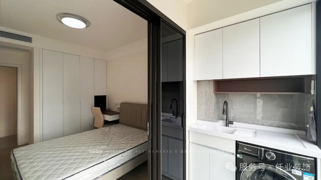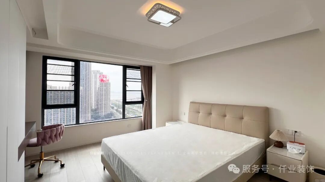 卧室的配色沿用了客厅的色调,以黑白米色为主题搭配整个空间,营造了和谐又统一的环境,极简风的设计巧妙平衡了向往的生活与工作的繁忙,回到自在私域,尽享美好时光。