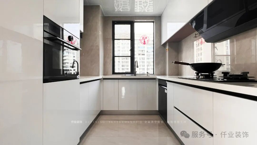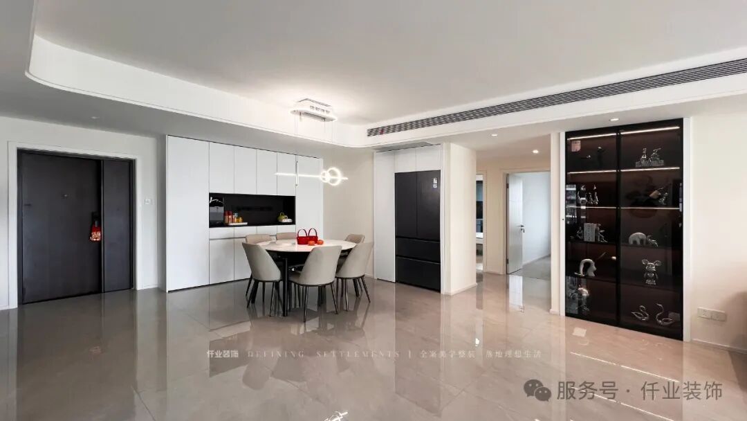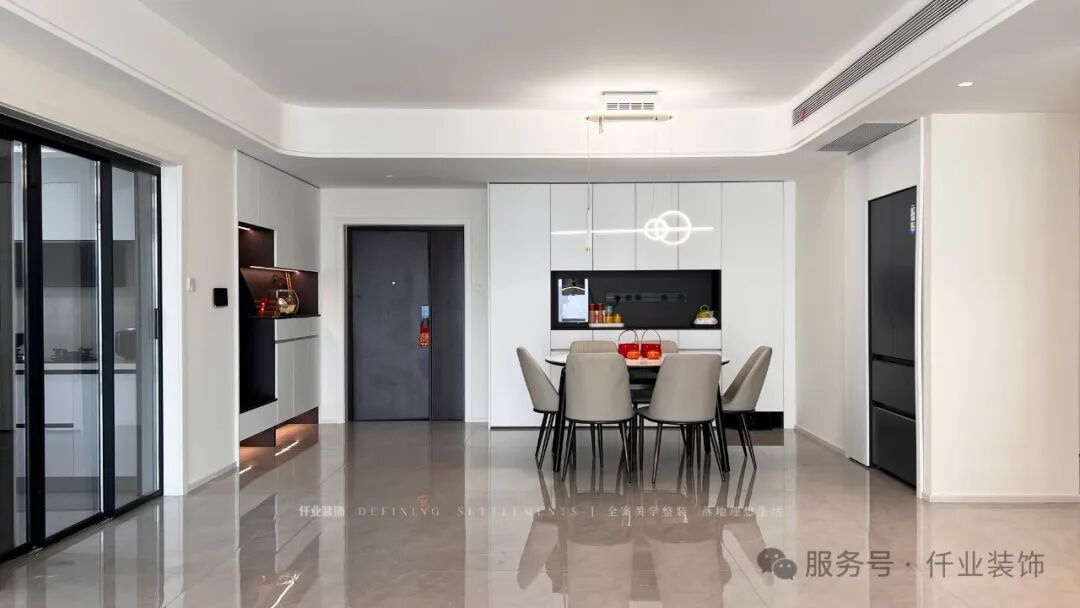 餐厅空间与客厅联通,秉承着留白和极简的设计理念,餐厨以简单元素构成,嵌入式家电让餐厅的动线更加舒适,极简的定制收纳实用又美观。