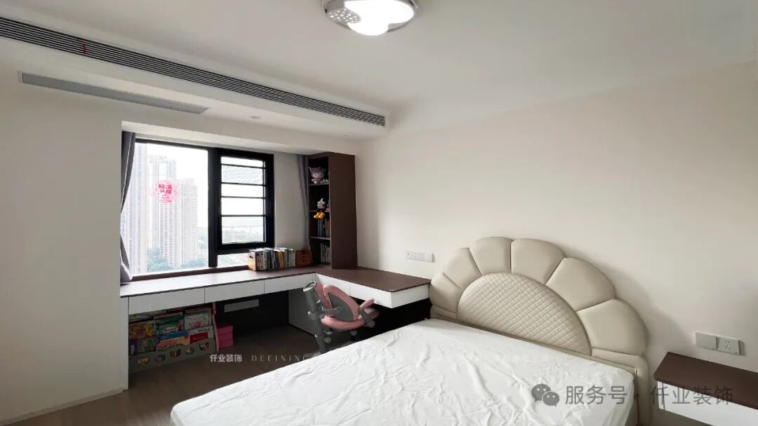 根据居者所需不同而“下笔”,主卧以顶天立地的柜体为主,增加收纳空间。考虑到学习需求的重要性,儿童房的书柜与窗边的L型书桌、学习椅,处处皆为细节。