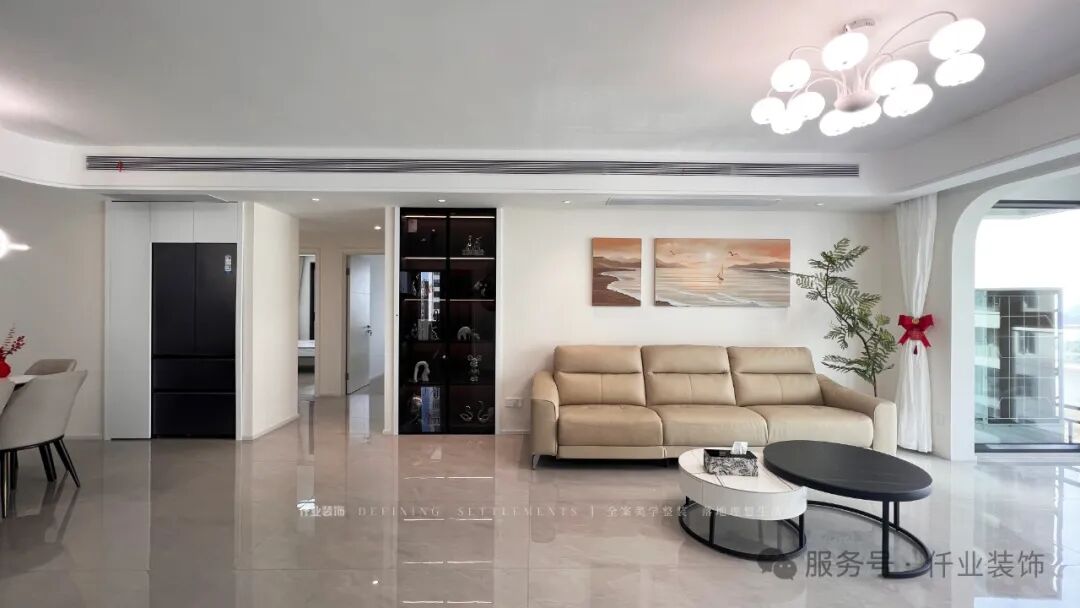 空间配色基调柔和,利落干净的线条与拱门圆弧角的收口,透露出理想生活的干净别致。