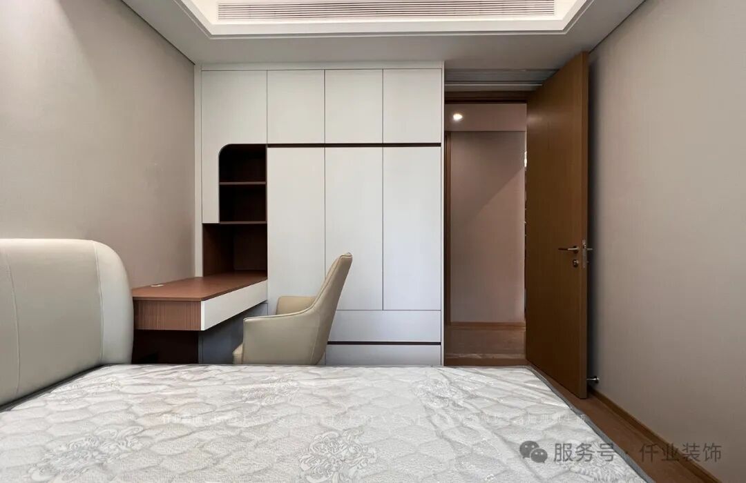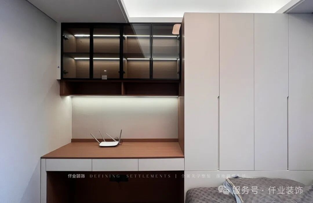 次卧中定制的不同造型的木质衣柜契合了空间的轮廓,巧妙地收纳一切杂乱。书桌上方的灯带与黑色玻璃材质展示柜中内嵌的灯带,满足独处空间的光照效果。
