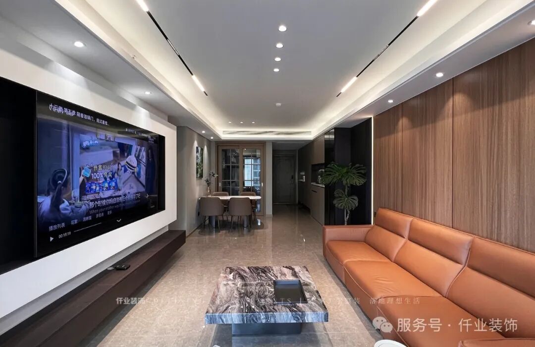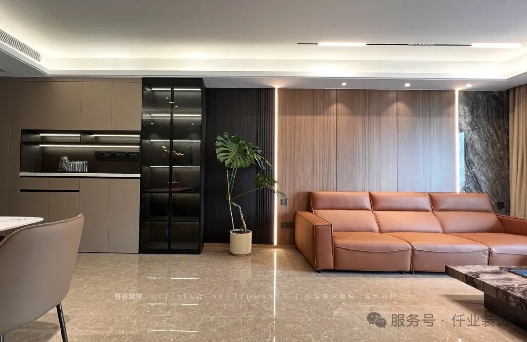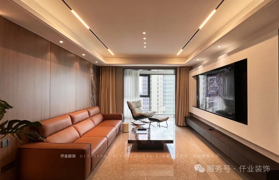 客厅的设计崇尚美学与功能性的平衡,皮质沙发、大理石茶几、绿植盆栽、布艺躺椅、各种各样的软装烘托着家的精致;无主灯的设计模式,让空间光影叠加,轮廓立体清晰;墙上与桌间流淌的水墨色纹路,不经意间显现出美的肆意。