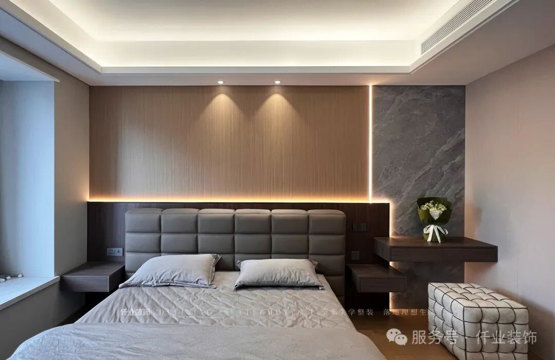 设计独特的床头柜,方形皮质座椅,墙面板材与石材的混合运用,搭配全卧无主灯的设计、造型简单的氛围灯与床头灯带,营造出十足温馨的氛围,为卧室增添了不少暖意。