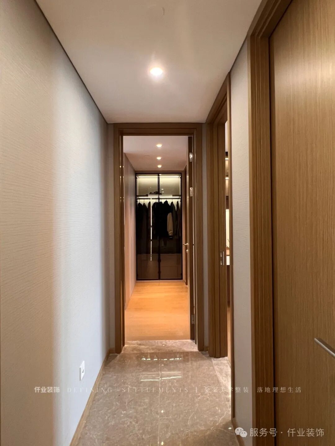 由连廊步入主卧,整齐简洁温馨的光线与布局让人忘却白日的压力与烦恼。设计师在主卧的入口处选择了玻璃衣柜,整个空间有了一定的延伸,也带来了独特的精致细节。