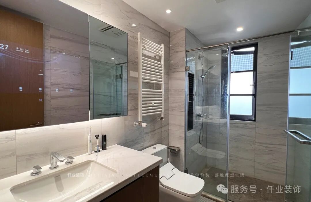 在氛围的打造方面,灯带藏于镜内,墙体与地面都选用的素雅墙砖,卫浴显得更为干净与通透。安装电热毛巾架,拯救了冷冽的冬天和梅雨季节,让温暖触手可及。
