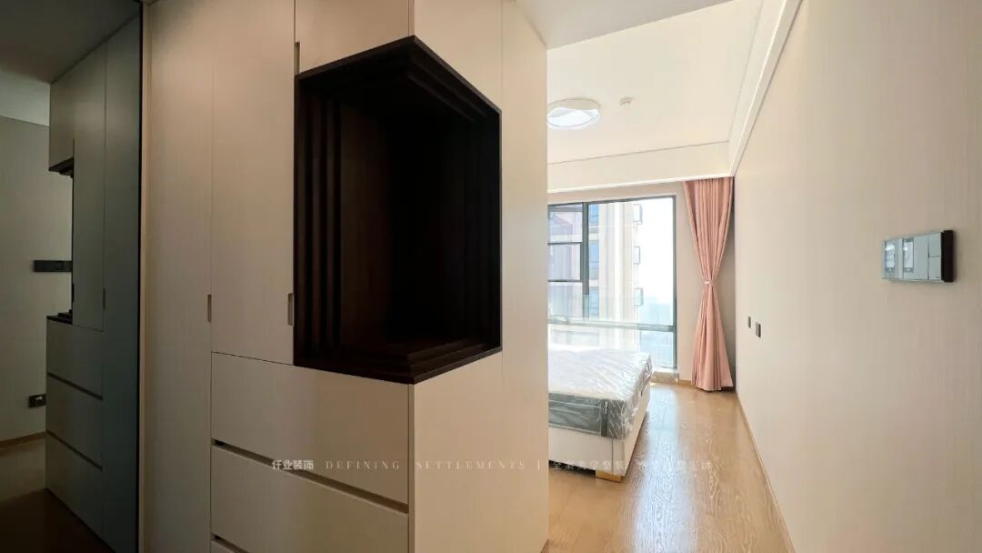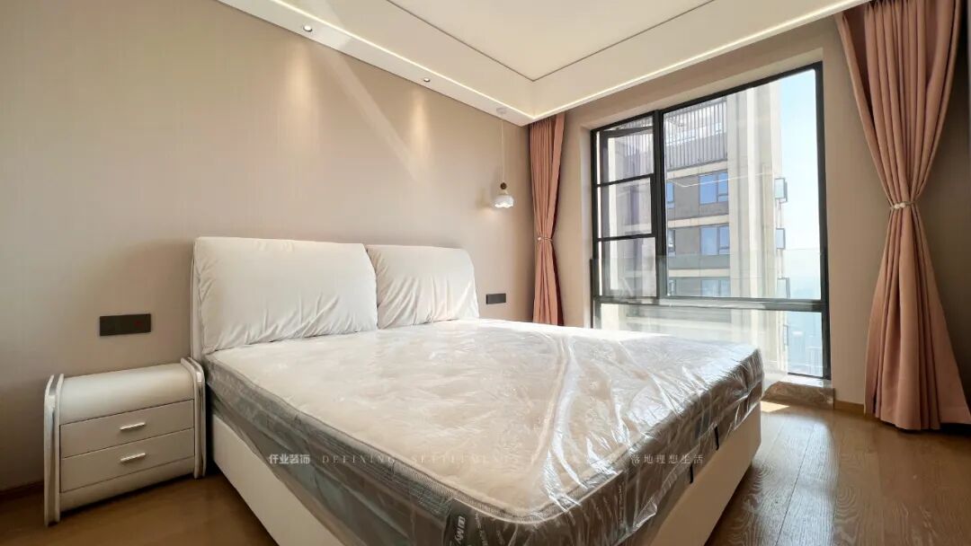 主卧尽可能减少不必要的装饰,色调延续了客餐厅的色调,糅合低反差的奶油色和珊瑚粉,营造空间的松弛感,调和功能性结构与审美品味,选用温柔色调与亲肤质感,萦绕出温馨感。
