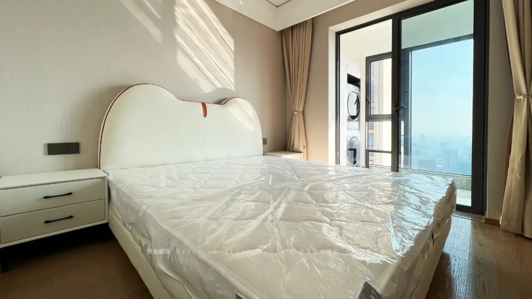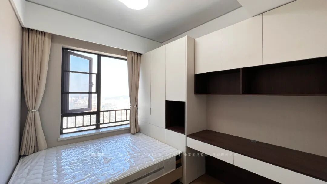 次卧与阳台相连,宽敞的落地窗敞开怀抱迎接着温暖的阳光,将自然的光芒慷慨地洒满房间。床头异形软包设计,不仅增添了一抹柔和的质感,更在细节之处展现了空间的精致与品味。