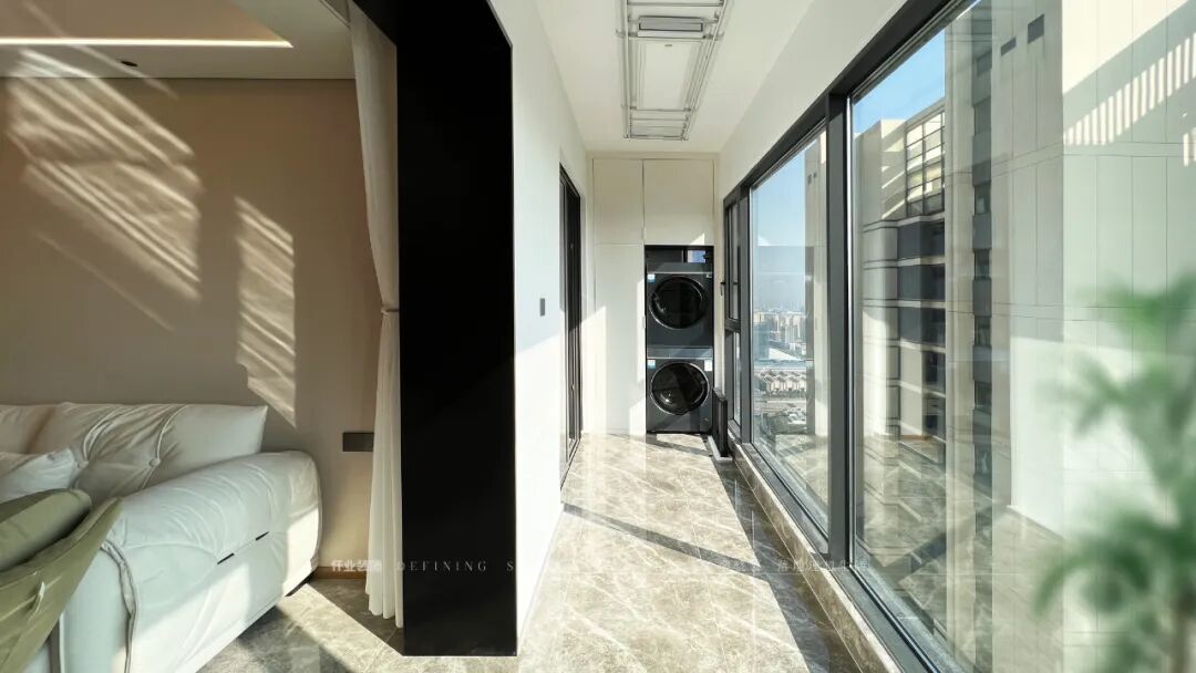 开敞明亮的空间打开居家的仪式感,大面积的阳光带来充沛的光线,将阳台收入室内,尺度和格局更加广阔,阳台设置洗烘家政区域,生活井井有条 。