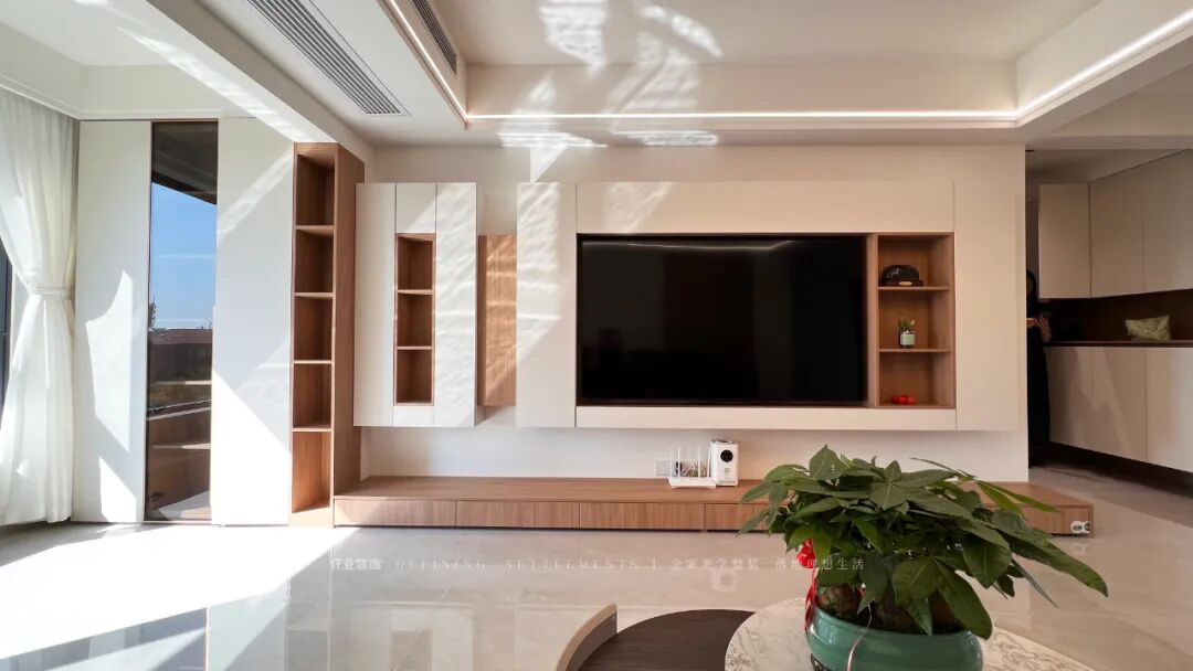 鉴于室内储物功能欠缺,电视背景墙设计化繁为简,采用柜体拼接,展现极致简约美学。灯光下,木质块面更显理性与静谧之美,空间因此而更显深邃与高雅。