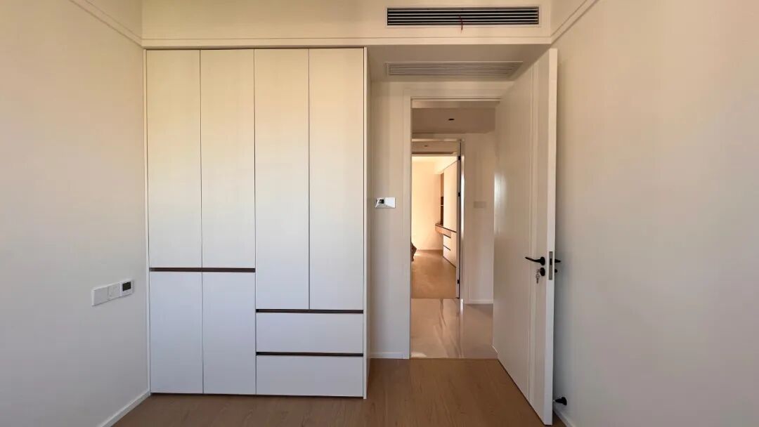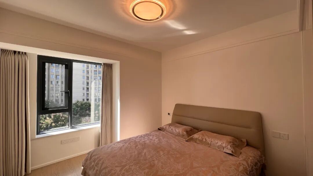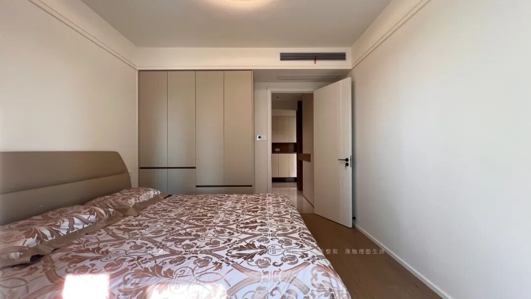 次卧空间设计也考虑到居者长辈的适老化需求,优雅配色的基础上,没有更多复杂设计,简单的圆形顶灯散发着拥有治愈力量的光泽。