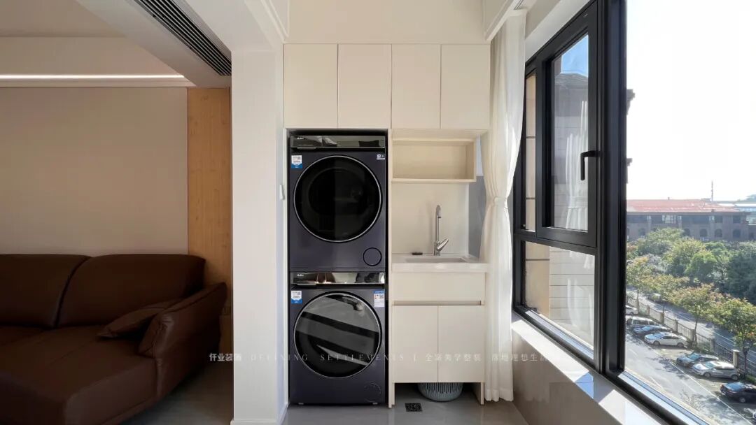 开敞明亮的空间打开居家的仪式感,大面积的阳光带来充沛的光线,将阳台收入室内,尺度和格局更加广阔,角落设置洗烘家政区域,生活井井有条 。