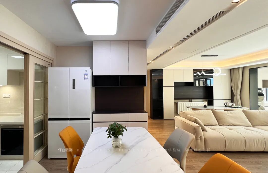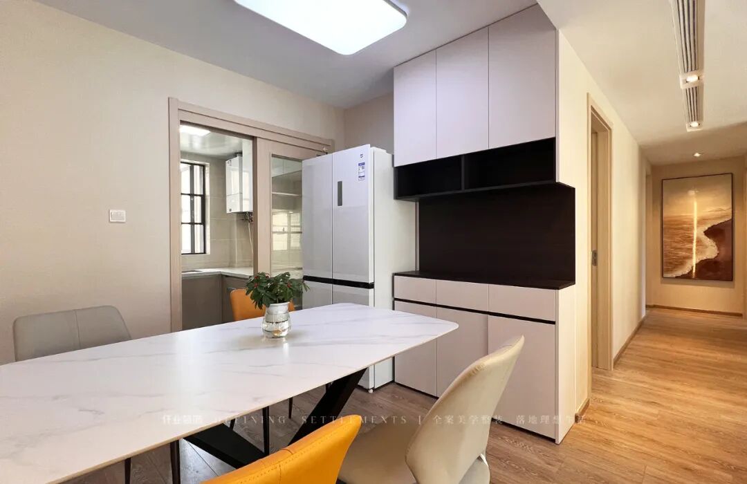 通铺木地板自入户玄关、餐厅延伸至客厅,使空间宛如流动的音符。爱马仕橙元素的巧妙点缀打破了原有木白色调的宁静,不经意间延续了灵动的韵律。